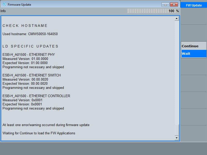 b.) CMWC, CMW500啟動過程中有些板卡沒有識別出來,出現(xiàn)紅色warning提示,如圖6所示。這時需要關掉CMWC,單獨打開每臺CMW500做自檢,看看是哪臺CMW500出現(xiàn)問題,如果重刷fireware問題還存在,則需要聯(lián)系R&S技術服務人員。
