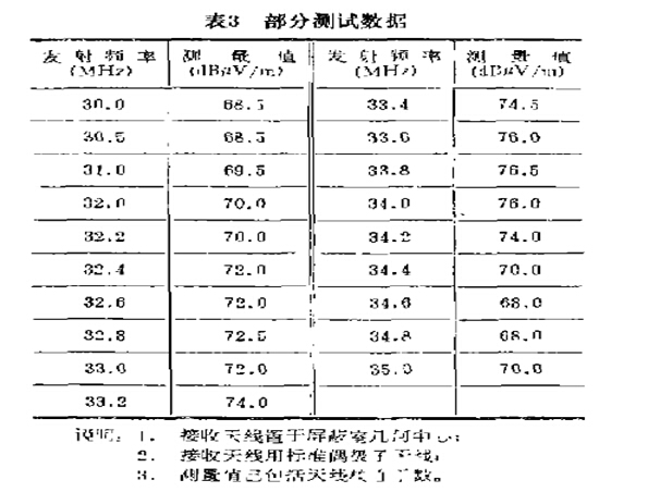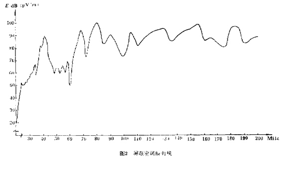 為了掌握實(shí)際使用情況,在20-200MHz頻率范圍內(nèi),我們利用高靈敏度接收機(jī)進(jìn)行了精確測試。測試曲線如圖2所示,部分測試數(shù)據(jù)(第一諧振峰附近)在表3中給出。