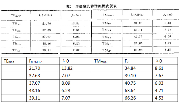 表2列舉了通過公式2計算的屏蔽室內(nèi)幾個低次模的諧振頻率。