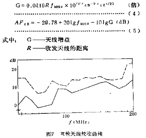 圖7說明,測試天線架高2m,距離1m。在開闊場地測量時,天線周圍3m距離范圍之內(nèi)無障礙物,在屏蔽到內(nèi)測量時,天線置于屏蔽室的幾何中心利用(4)(5)兩式即可給出天線校準(zhǔn)系數(shù)的頻響關(guān)系曲線。圖7給出了雙錐天線在開闊場與屏蔽室內(nèi)的校準(zhǔn)曲線。從上圖中我們發(fā)現(xiàn),在30~200MHz范圍內(nèi),雙錐天線在開闊場與屏蔽室內(nèi)的校準(zhǔn)曲線具有大致相同的趨勢。由于屏蔽室內(nèi)存在反射現(xiàn)象,因而天線系數(shù)明顯高于自由空間開闊場的校準(zhǔn)系數(shù)。