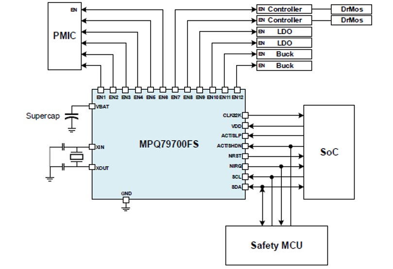 MPQ79700FS 是一款專為汽車高級駕駛輔助系統(tǒng) (ADAS) 和自動駕駛平臺設(shè)計的 12 通道功能安全電源時序芯片,可為需要多個電源軌道供電的SoC提供必要的上下電時序控制。該設(shè)備的可配置性和靈活性支持跨不同的設(shè)計應(yīng)用。用戶可通過I2C對12個通道進(jìn)行獨立配置每個通道的拉高拉低時序序列。 同時,12個通道中的四個還可以被設(shè)置為GPIO,以滿足用戶的額外需求。MPQ79700FS電源時序芯片包含一個振蕩器,通過驅(qū)動芯片外部晶體震蕩以發(fā)出32.768 kHz的時鐘信號,以及一個具有報警功能的實時時鐘 (RTC)。該芯片還包含可通過 I2C 接口訪問的可配置看門狗,低電平有效的系統(tǒng)復(fù)位以及中斷輸出來保證故障監(jiān)測和報告。