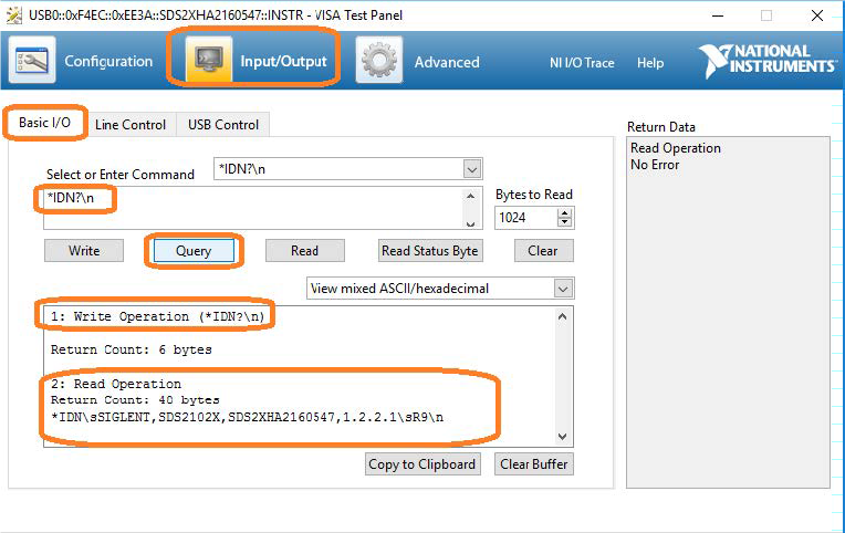 9)VISA測試面板中另一個有用的項目是輸入/輸出功能。 此模式允許您發(fā)送特定儀器命令和接收儀器響應。