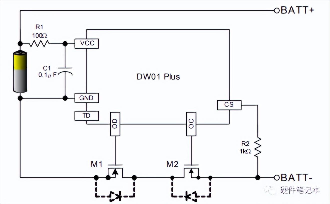 還是回到DW01芯片與8205 MOS管應(yīng)用電路圖中,鋰電池、M1 MOS管和 M2 MOS管內(nèi)部下面的二極管構(gòu)成一個完整的放電電路。