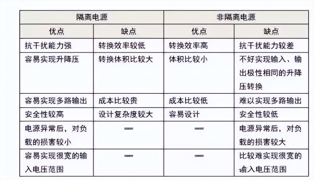 下表,隔離電源和非隔離電源的優(yōu)缺點(diǎn):