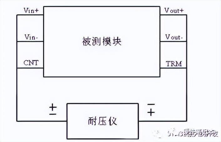 作為模塊電源的重要指標(biāo),標(biāo)準(zhǔn)中也規(guī)定了隔離耐壓相關(guān)測(cè)試方法,簡(jiǎn)單的測(cè)試時(shí)一般采用等電位連接測(cè)試,連接示意圖如下: